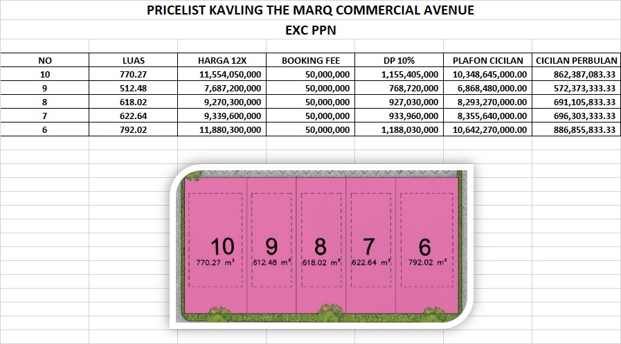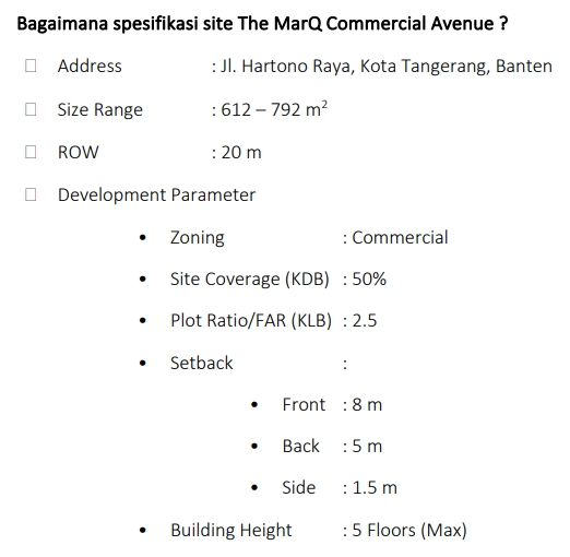 also available The MarQ Commercial Avenue bersebelahan dengan the marQ estate , dapat dibangun hingga 5 lantai, high traffic lebih dari 25.000 kendaraan perharinya, nempel langsung jalan utama sebrang tang city , dapat dimiliki dengan sistem Booking 50 juta sebagai berikut